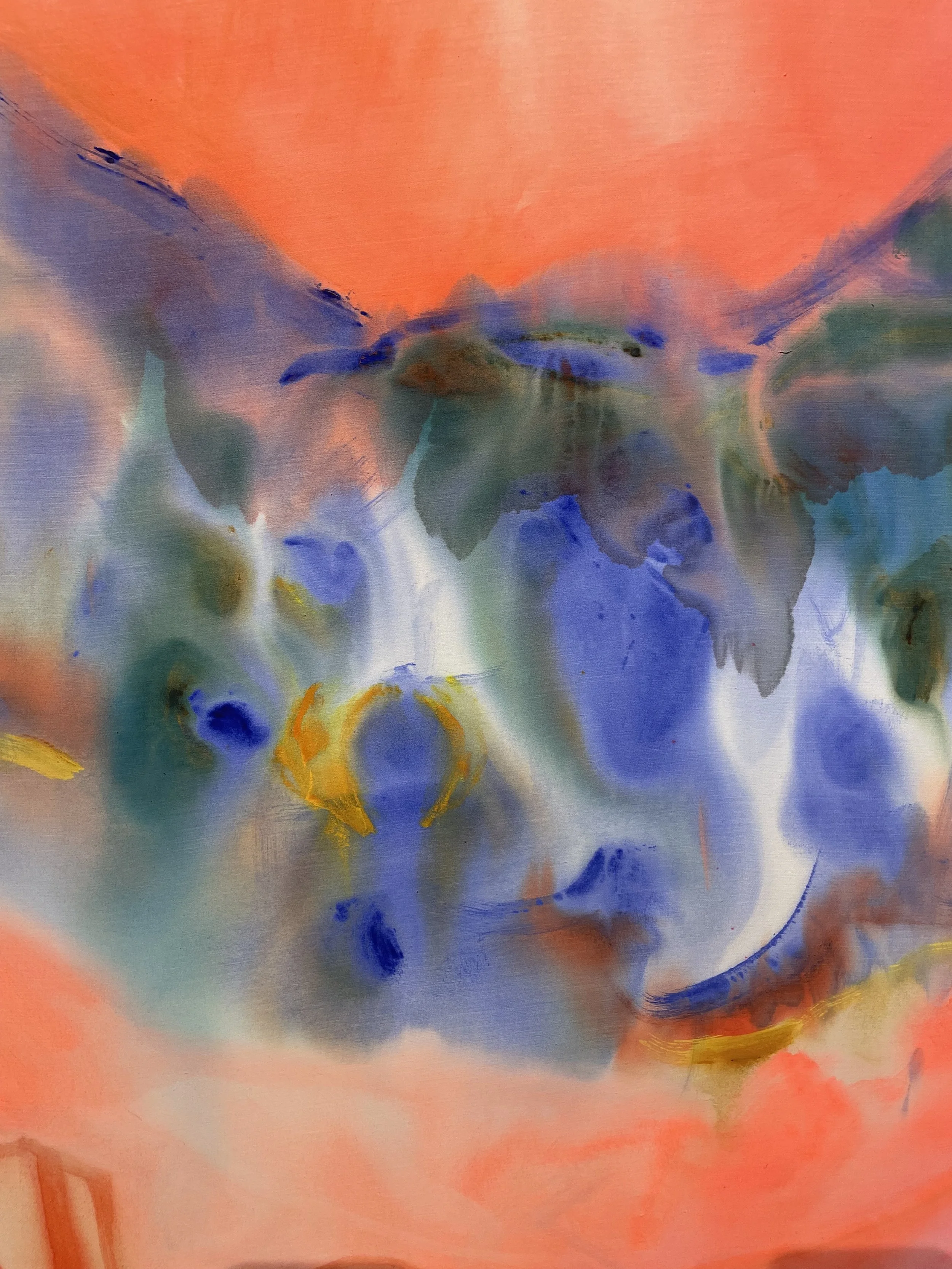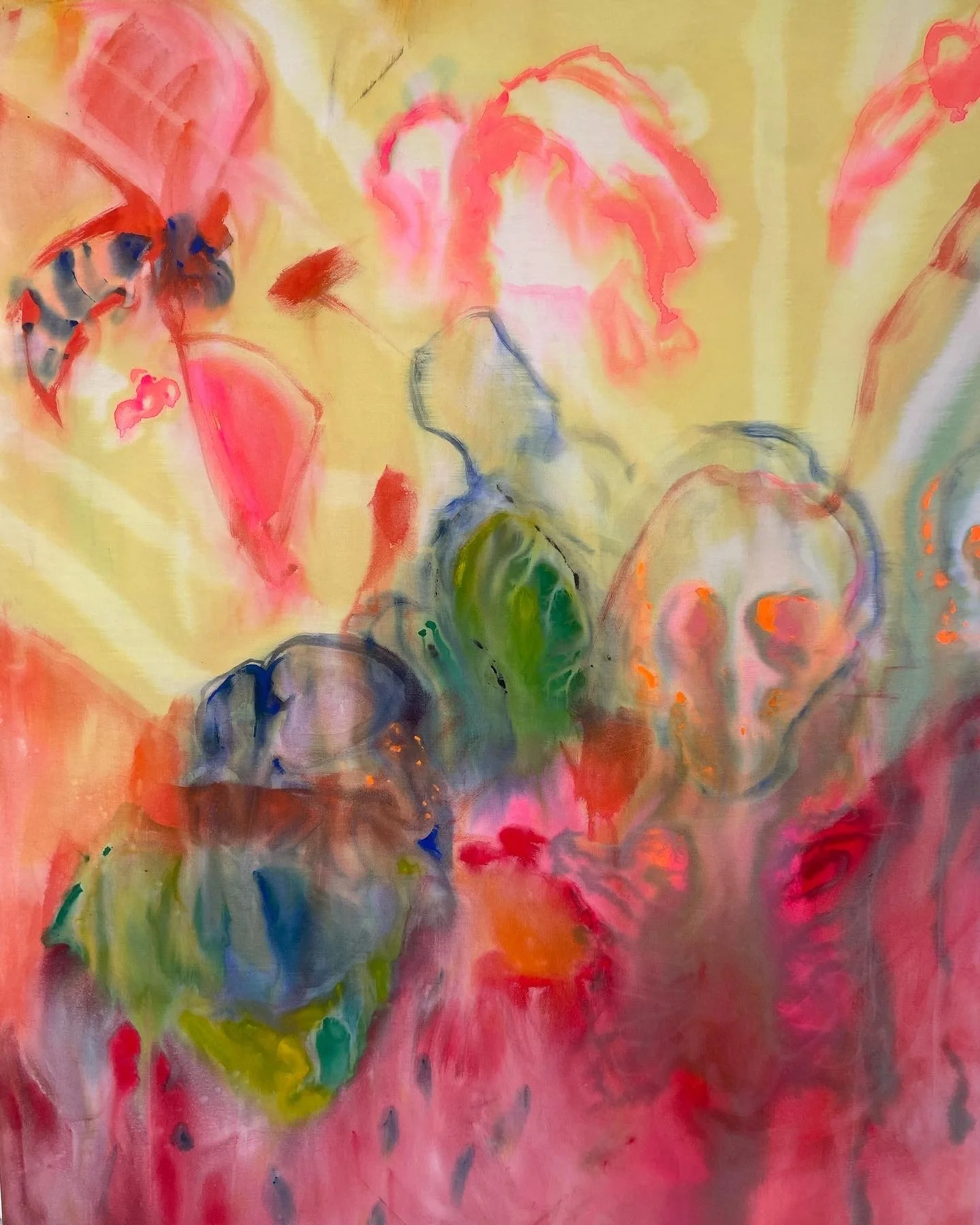 Strange Devotion! ,2023, Watercolor & Bleach on Bedsheets, 52 x 50 inches